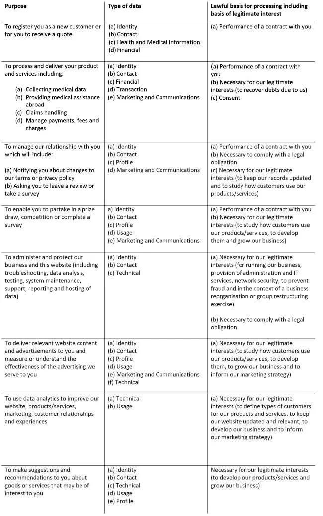 - Underwriters: our underwriters will assess risk, calculating premiums and what kind of cover we can offer. The type of data we will process are Identity Data and information about your trip for us to understand the likelihood of a certain event that may occur. With the results, we will determine the premiums and extent of cover.